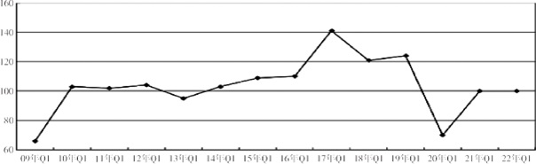 2022年一季度,外贸出口景气指数为100,比上季度下降了3个百分点,与去年同期持平,位于"微景气区间"(见图7)。其中,有27%的调查企业国外订单有了新的增长,比上季度下降了2个百分点;有46%的企业反映销售"持平",比上季度上升了1个百分点;有27%的企业反映"下降",比上季度上升了1个百分点。